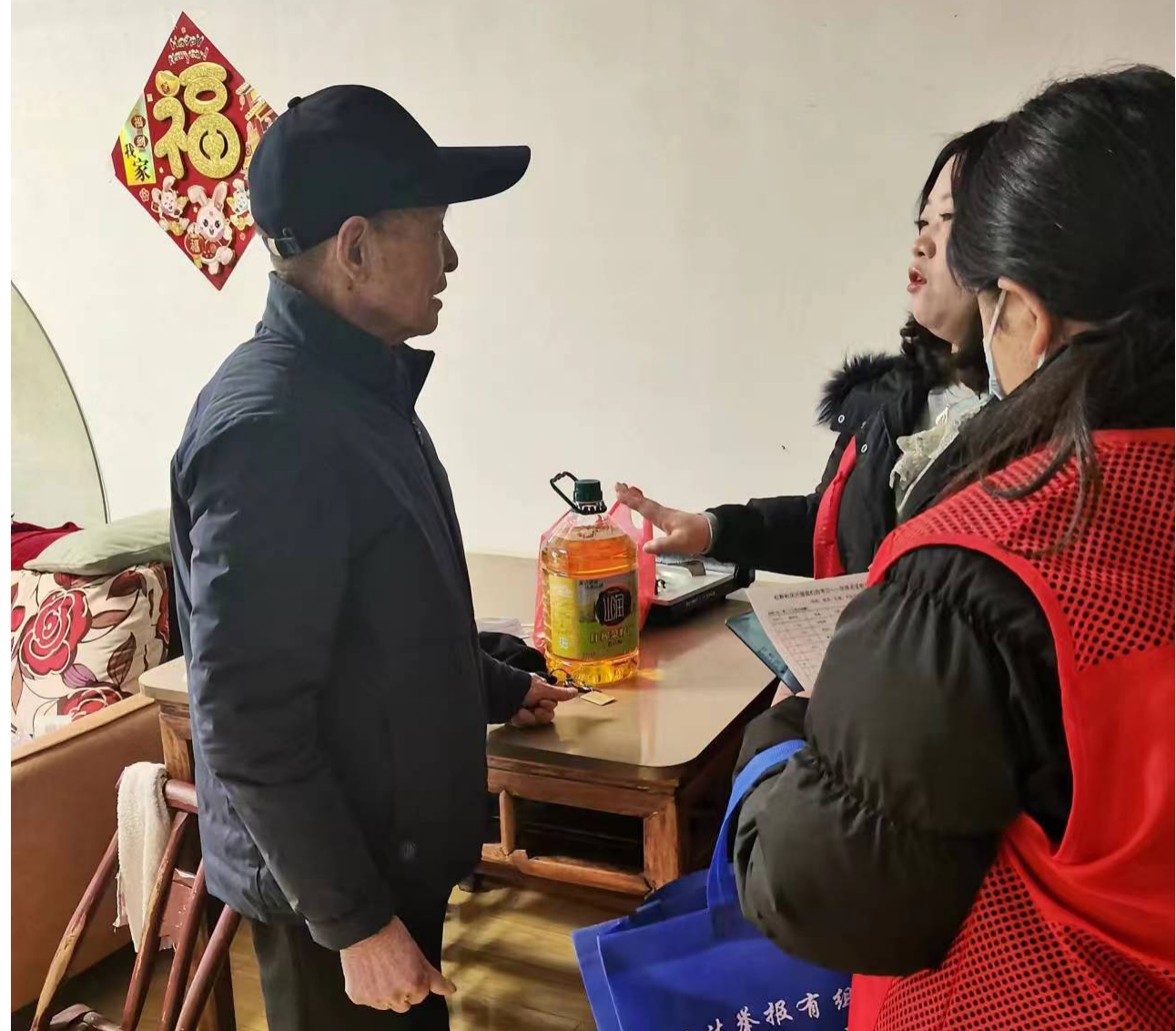 红桥社区组织武汉市晚晴枫居家养老服务中心、辖区共建单位、文明单位、居住地下沉党员,对辖区的残疾群众、孤寡老人、高龄老人结对“认亲”,走访慰问这些需关爱的“亲戚”,通过送政策、送服务、送暖心“三送”行动,坚定了全心全意为群众服务的信心与决心,转变了工作作风,提高了工作效能。与群众建立感情打成一片、工作在一线推动、成效在一线检验,“认亲”走访慰问活动中,党员对辖区高龄老人、独居老人、残疾人、失独家庭等进行了亲切交谈,详细了解老人们的身体状况和家庭情况,为他们送去大米和食用油,带去新春的祝福,同时叮嘱要注意冬季防寒保暖和居家用电用火等安全,增强自我防护安全意识。大家对春节前的慰问关怀感到非常开心,表示感谢党和政府的关爱。