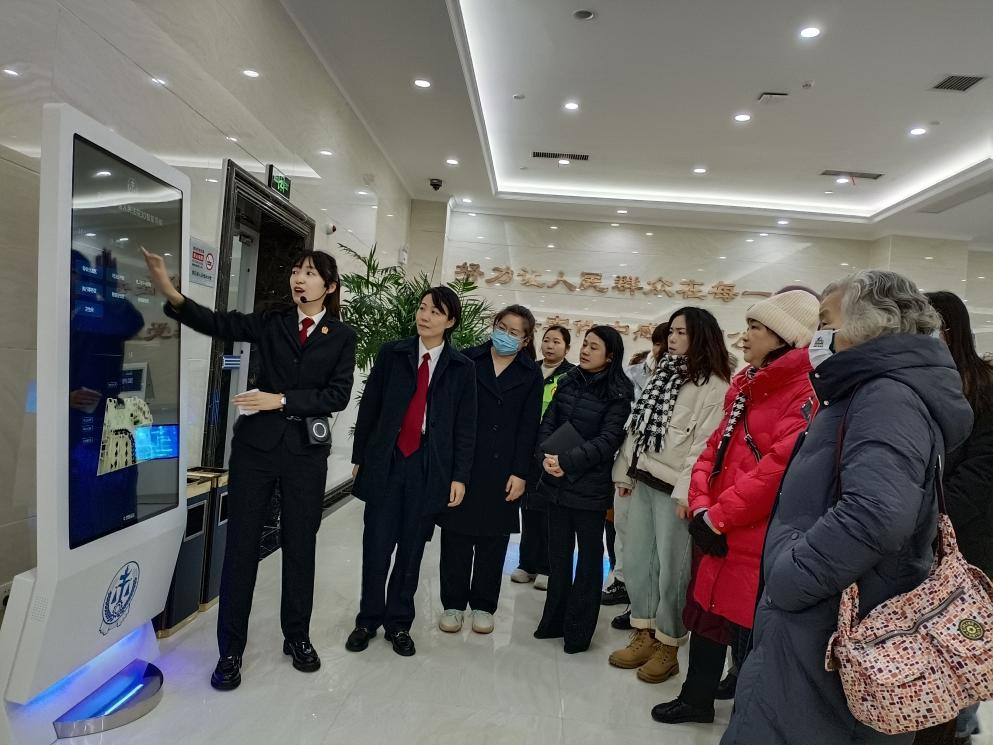 1月25日,武汉市江汉区汉兴街道桃林社区“黄姐有法子”法律工作室联合武汉市中级人民法院开展“微光成炬·益汇江汉”——参观智慧法院活动。邀请“万花筒”志愿者和社区居民、华中科技大学“荆楚回唱”的选调生们一起走进武汉市中级人民法院诉讼服务中心,让他们近距离感受“智慧法院”的一站式诉讼服务机制。