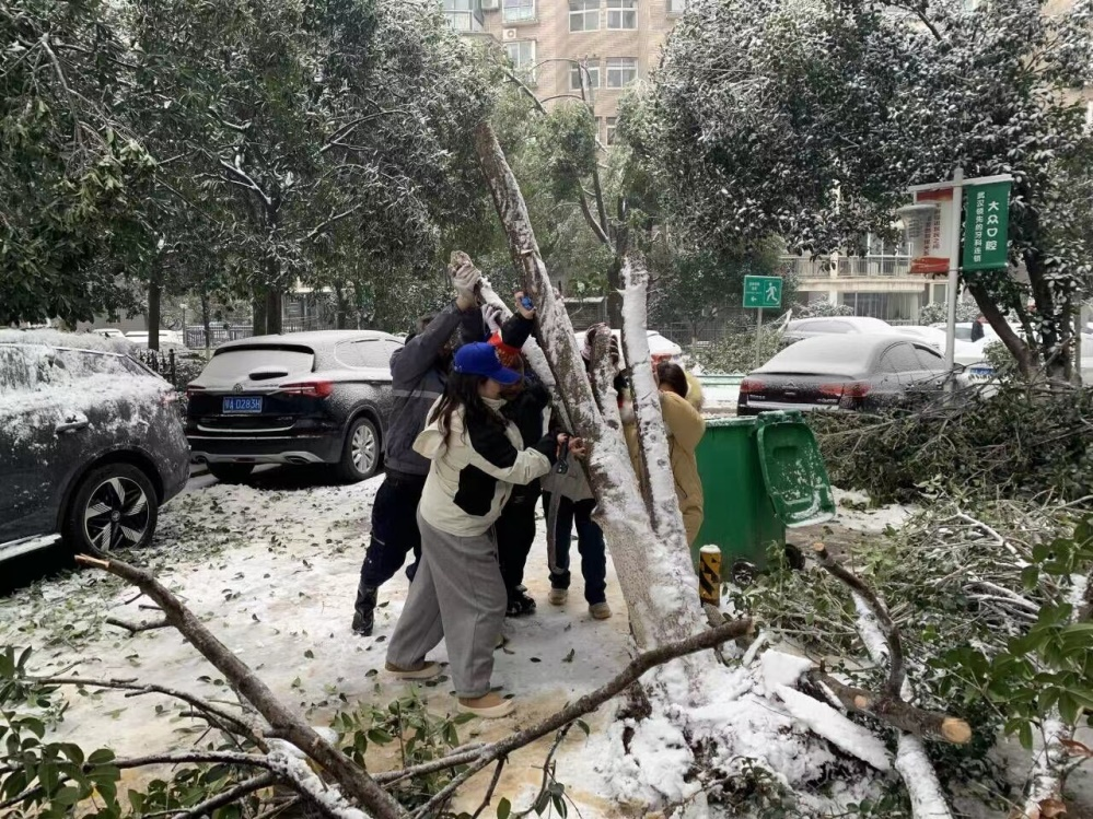 第一轮铲雪开路,志愿者们齐心协力、不畏严寒,挥舞着铁锹、扫帚等劳动工具,分工协作、分区清扫。第二轮将挡在路中间压倒的树枝,搬的搬,抬的抬,拖的拖,用坚实的臂膀在冻雪中开出一条条道路。第三轮分组撒盐以防今晚道路结冰,忙碌的身影在皑皑白雪中构成了一道亮丽的风景线。