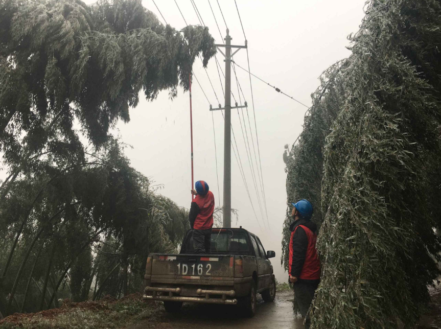 湖北咸宁突下冻雨,国网咸宁咸安区供电公司员工正在积极抢修恢复供电。(图/符珉)