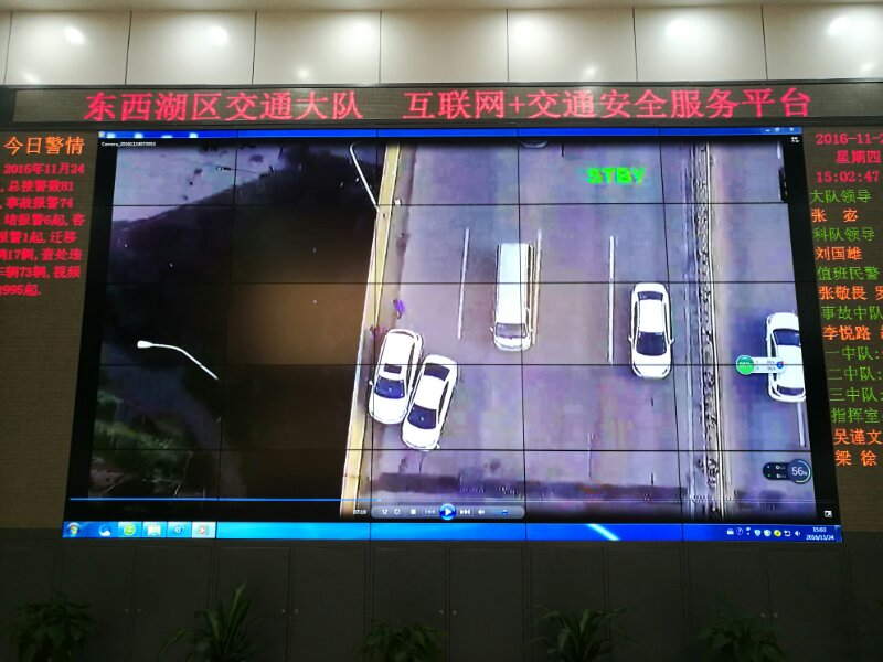 与此同时,在东西湖区交通大队监控中心的大屏上清晰的看到无人机传回的画面,后台民警根据现场图像,迅速指派民警到现场疏导,并处理交通事故。