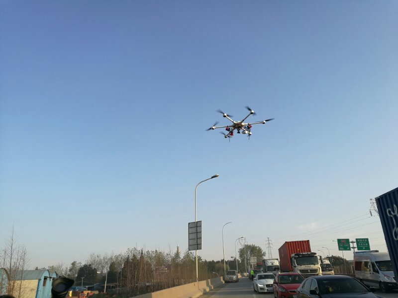 长江云报道(记者 邹敏)11月24日凌晨6时许,一架直径1.6米的6轴旋翼无人机在三环线东西湖段拔地而起,随着无人机的不断上升,三环线长丰桥路段车辆流量、交通状况清晰可见。突然,三环线额头湾匝道处发生两辆白色小车相擦的交通事故,占据了二股车道,2名车主下车后争执不休,影响了后面车辆通行,逐渐形成排长队情况。操作无人机的民警发现这一情况,迅速将无人机飞至交通事故现场上方,拍摄事故现场后,通过高音喇叭向车主喊话,“交通事故现场已经通过高清摄像取证,请立即撤除现场,不要造成三环线交通拥堵。”车主听到喊话后,很快撤除现场,驾车到开阔地带靠边停放。三环线车流又恢复畅通。