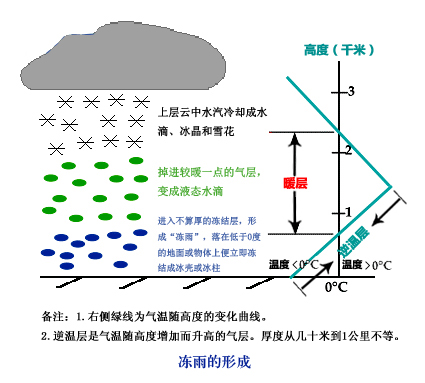 答:冻雨是出现在冬春季节的一种降水天气现象,当较强的冷空气南下遇到暖湿气流时,冷空气插在暖空气下方,近地层气温骤降到零度以下,暖湿空气被抬升,此时形成的降水由冰水混合物组成,雨滴温度在0℃左右,在空气中保持过冷状态,当它落到温度为 0℃以下的物体上时,立刻冻结成外表光滑而透明的冰层,称为雨凇。