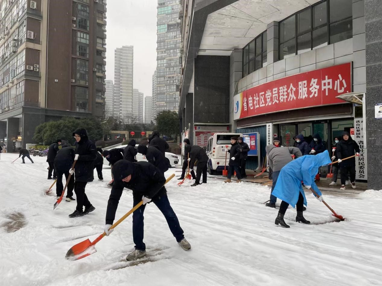 武汉地铁集团和武汉股权托管交易中心的领导及工作人员一早联系社区,了解到大雪后居民出行不便的实际困难后,主动请缨,集合50余名党员,临时组建铲雪除冰突击队,奔赴东湖尚郡、徐东嘉园、梨园小区三个小区,经过三小时艰苦奋战,成功开辟了三个小区的进出口通道及小区内主干道积雪,方便了辖区居民群众正常出行。