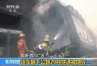 11月22号,一辆从四川成都开往辽宁沈阳的物流运输车,因雨天路滑、车辆失控,在京昆高速绵阳往广元方向沙溪坝友谊大桥处,翻下大桥,货车砸中旁边一户民房,车身起火将居民堆放的木材引燃。车上载有的快递包裹已经起火,消防官兵用水枪对货箱里的明火进行压制,将货箱里残余的货物进行了转移。据了解,事故造成20多吨快递被烧毁,京昆高速拥堵近10小时。