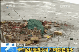 黑龙江:卡车坠桥砸进冰河 20吨货物落水