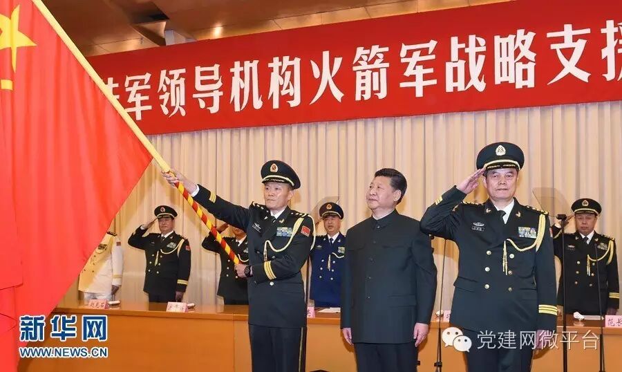 2015年12月31日,中国人民解放军陆军领导机构、中国人民解放军火箭军、中国人民解放军战略支援部队成立大会在北京举行。习近平向陆军、火箭军、战略支援部队授予军旗并致训词。习近平强调,陆军要“加快实现区域防卫型向全域作战型转变”;火箭军要“增强可信可靠的核威慑和核反击能力,加强中远程精确打击力量建设,增强战略制衡能力”;战略支援部队要“高标准高起点推进新型作战力量加速发展、一体发展”。