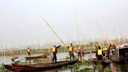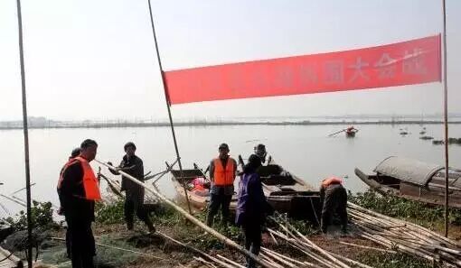 在现场,港口村渔民自发组织的十余条渔船近30人在湖面上一字排开,有的在拔竹竿,有的在拆围网。