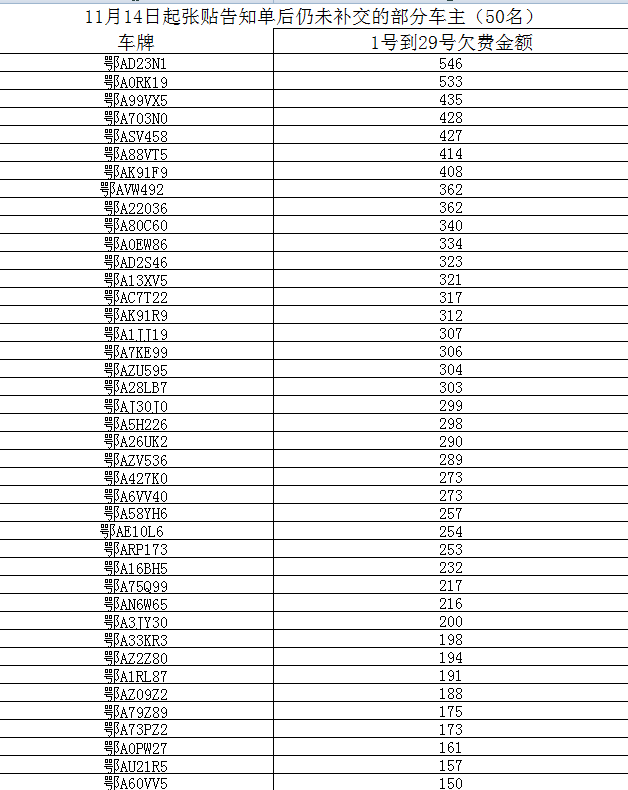 附.11月14日起张贴告知单后仍未补交的部分车主(前几十名)。