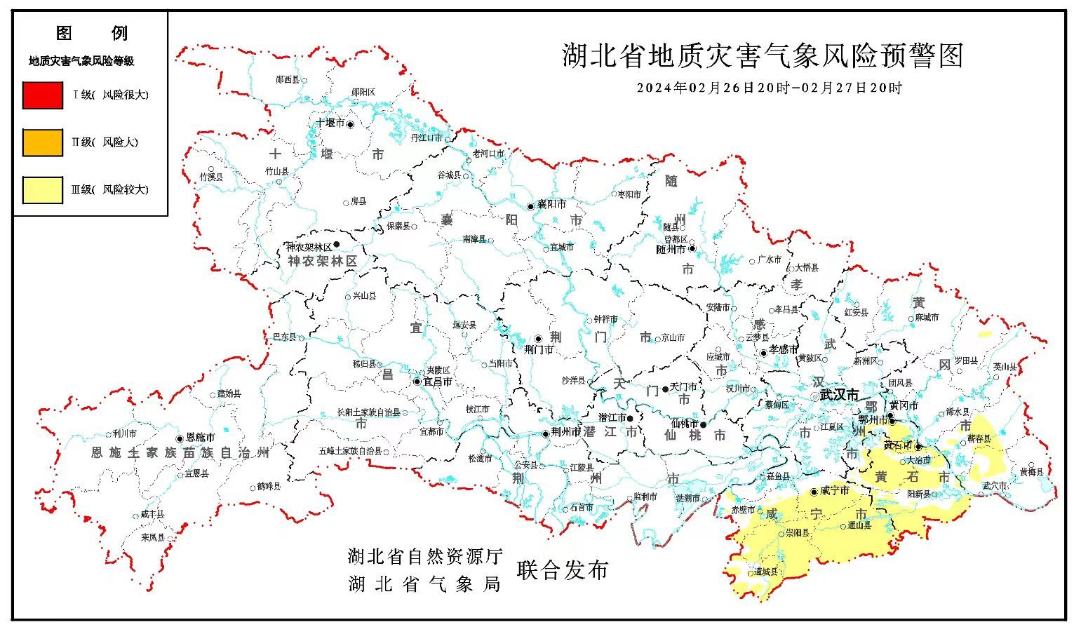 2024年2月26日20时—2月27日20时,预计鄂州市、黄石地区,咸宁(咸安区、赤壁、崇阳、通城、通山)、黄冈(罗田北部局部、蕲春中部和西部、武穴)以及其他冰雪冻融区域发生崩塌、滑坡、泥石流的风险较大,请相关地方政府及有关部门按照《湖北省地质灾害防范规程》和预警响应工作方案做好地质灾害防范工作。