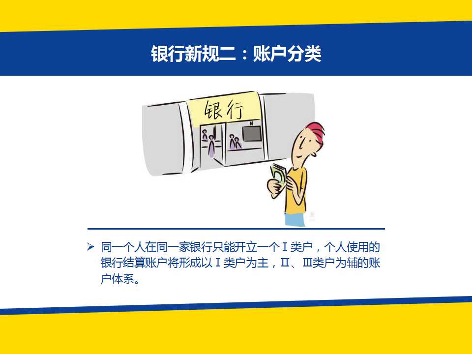 新规2:账户分类。同一个人在同一家银行只能开立一个Ⅰ类户,个人使用的银行结算账户将形成以Ⅰ类户为主,Ⅱ、Ⅲ类户为辅的账户体系。Ⅰ类账户是全功能的,Ⅱ类账户不能取现金,不能向非绑定账户转账,单日支付限额10000元,Ⅲ类账户用于网络支付、线下手机支付等,余额不得超过1000元。Ⅱ、Ⅲ类户只有账号,没有实体卡。