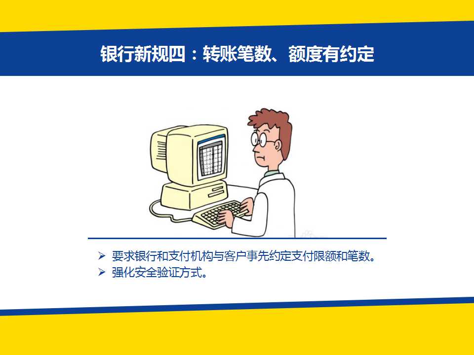 新规4:转账笔数、额度有约定。要求银行和支付机构与客户事先约定支付限额和笔数。超过限额和笔数的,银行账户转账应当到银行柜台办理,支付账户则不得办理。强化安全验证方式。除向本人同行银行账户转账外,银行为个人办理非柜面转账业务,单日累计金额超过5万元的,应当采用数字证书或电子签名等安全可靠的支付指令验证方式。大额交易提醒。单位、个人银行账户非柜面转账日累计分别超过100万元、30万元的,银行应当进行大额交易提醒,单位和个人确认后方可转账。