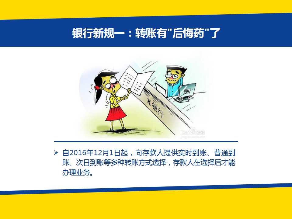新规1:转账有“后悔药”了。自2016年12月1日起,向存款人提供实时到账、普通到账、次日到账等多种转账方式选择,存款人在选择后才能办理业务。除向本人同行账户转账外,个人通过自助柜员机转账的,发卡行在受理24小时候办理资金转账。在发卡行受理后24小时内,个人可向发卡行申请撤销转账。以往我们曾经听过电信诈骗事例,或者出现转错账的情况,今后再转账就没那么容易了,有24小时的冷静期,一旦发现错误可以随时撤回。