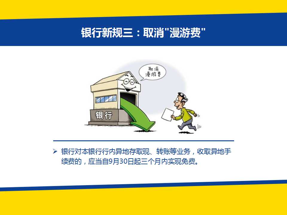 新规3:取消“漫游费”。银行对本银行行内异地存取现、转账等业务,收取异地手续费的,应当自9月30日起三个月内实现免费。从此个人在异地存取款就不再收费了,但是要注意取消的是同行存取款和转账,跨行办理仍然还是收费的,如果想跨行办理免费还是要借助手机银行。