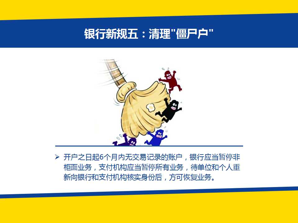新规5:清理“僵尸户”。开户之日起6个月内无交易记录的账户,银行应当暂停非柜面业务,支付机构应当暂停所有业务,待单位和个人重新向银行和支付机构核实身份后,方可恢复业务。不法分子购买账户和银行卡后,一般不会马上启用,因此对长期不用账户高度关注。