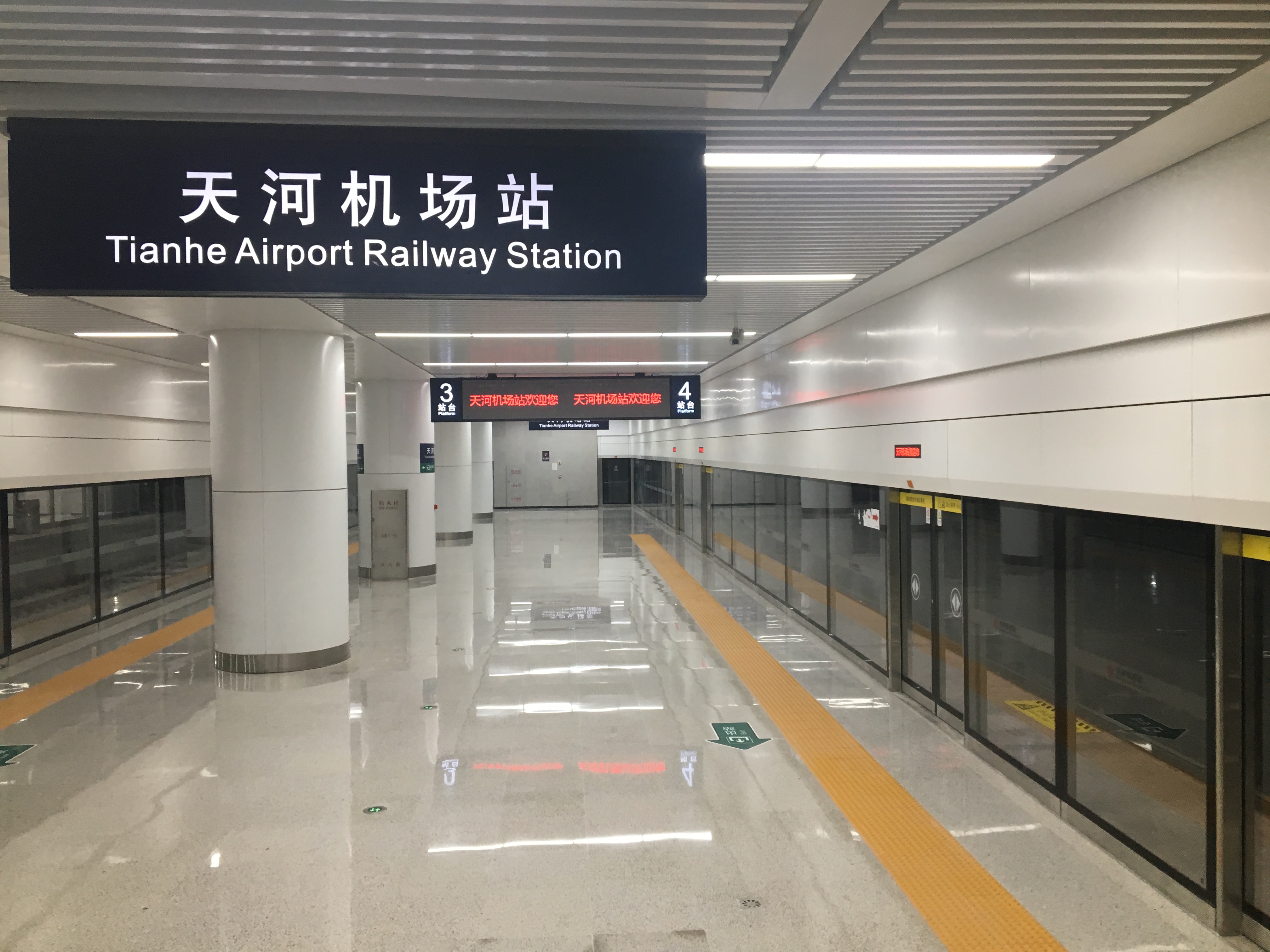 天河机场站位于天河机场交通中心下方,地下两层双岛式车站2台4线,城际铁路与地铁并行下穿天河机场T3航站楼。站房总建筑面积为29130平方米,地下一层为站厅层,中部为公共区,两侧为设备区,地下二层为站台层。