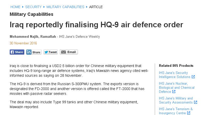 据《简氏防务周刊》网站11月30日报道,伊拉克mawazin新闻局援引内部人士11月28日所述,伊拉克即将敲定一笔价值25亿美元的中国军火订单,其中包括红旗-9远程防空导弹系统。