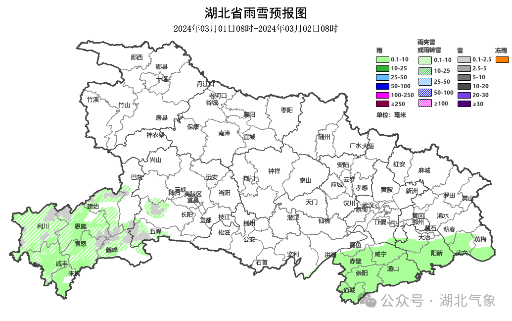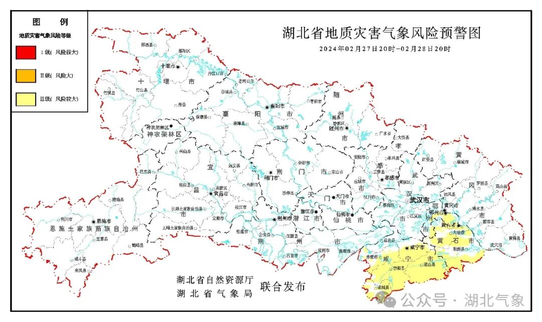 2024年2月27日20时—2月28日20时,预计鄂州市、黄石地区,咸宁(咸安区、赤壁、崇阳、通城、通山)以及其他冰雪冻融区域发生崩塌、滑坡、泥石流的风险较大。