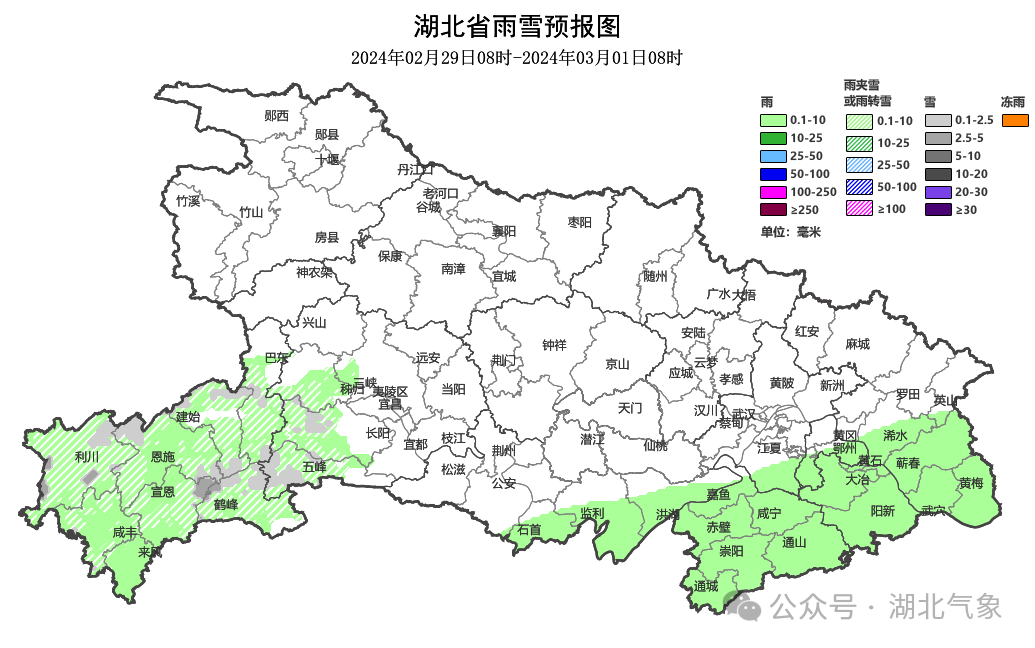 2月29日08时-3月1日08时,鄂西南、江汉平原南部、鄂东南小雨转阴天,其中西部高海拔地区有雨夹雪或小雪;其他地区阴天到多云。最高气温7~12℃,最低气温鄂西北0~2℃、其他地区2~6℃,偏北风3到4级、阵风5到7级。