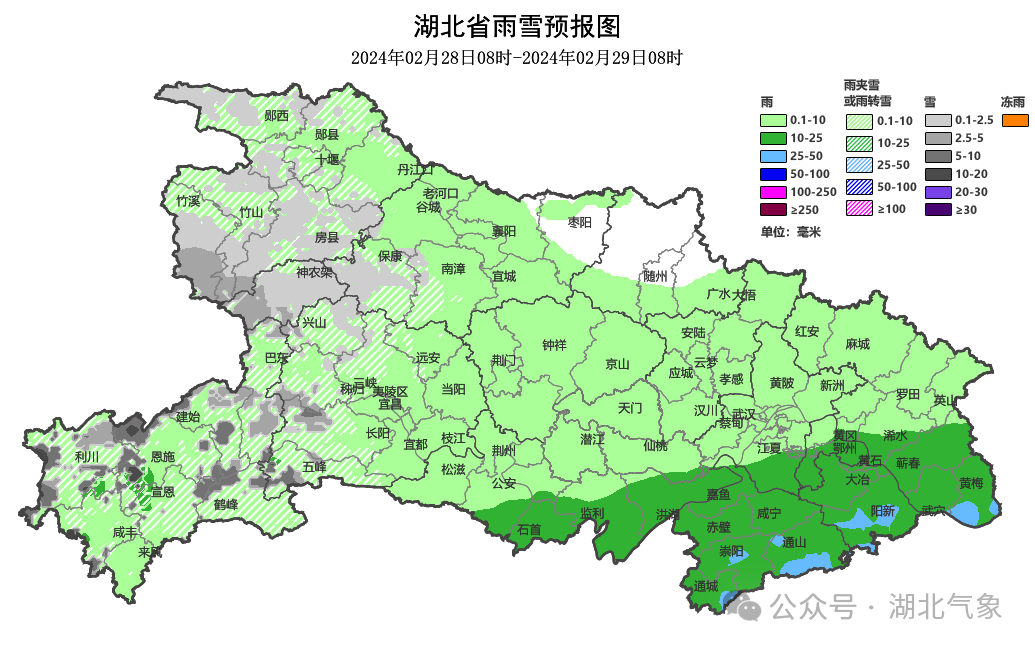 预计28日至29日白天,湖北省有一次降水过程。今天降水范围将扩大至湖北全省,夜间开始,受弱冷空气影响,降水增强,鄂东南局部有大雨,西部将有雨雪转换,山区局部有中到大雪。