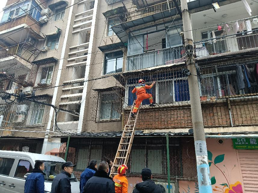 5分钟后,消防车辆到达现场,通过对老人房屋周边环境的观察,决定从阳台窗户进入家中实施救援,消防队随即开始破拆作业,几分钟后,消防员成功进入老人家里。