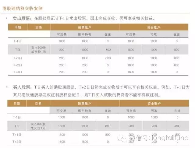 ▶ 内地投资者买入股票:T日客户买入股票立即可卖出(但并未划入账户),同时买入股票应付资金立即冻结,T+2日中国结算正式划拨资金给香港结算,此时资金正式从客户账户中划出,香港结算也将客户买入股票交给中国结算,此时股票才正式登记到客户的账户中。