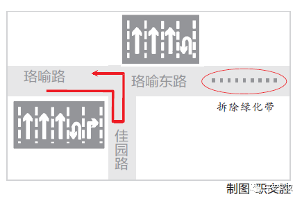 珞喻东路至佳园路口,拆除绿化带扩宽道路