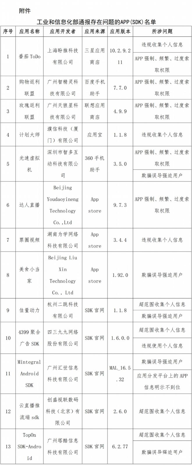 工业和信息化部高度重视用户权益保护工作,依据《个人信息保护法》《网络安全法》《电信条例》《电信和互联网用户个人信息保护规定》等法律法规,持续开展APP侵害用户权益专项整治行动。近期,我部组织第三方检测机构对群众关注的实用工具、在线影音等移动互联网应用程序APP及第三方软件开发工具包(SDK)进行检查。发现13款APP、SDK存在侵害用户权益行为(详见附件),现予以通报。