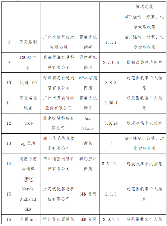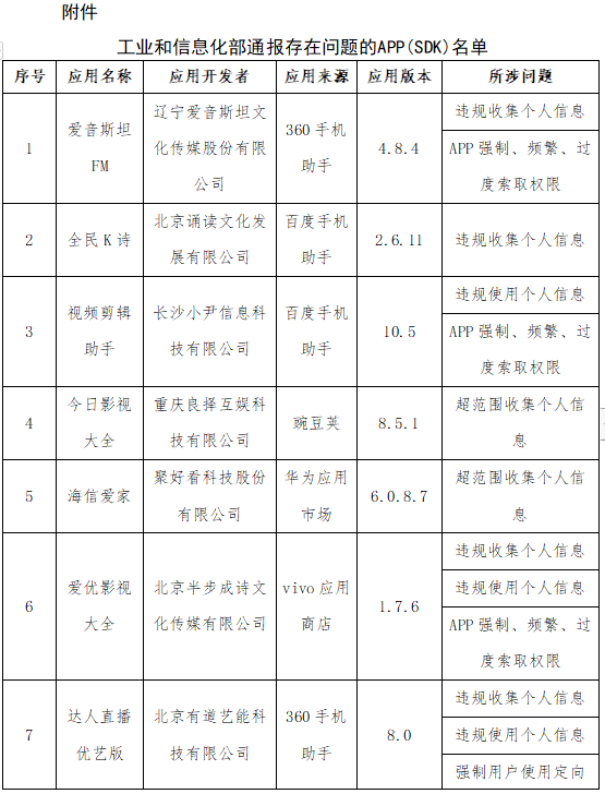 附件:工业和信息化部通报存在问题的APP(SDK)名单