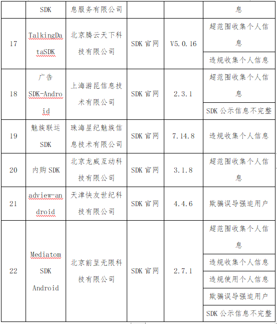 工业和信息化部高度重视用户权益保护工作,依据《个人信息保护法》《网络安全法》《电信条例》《电信和互联网用户个人信息保护规定》等法律法规,持续开展APP侵害用户权益专项整治行动。近期,我部组织第三方检测机构对群众关注的在线影音、网上购物等移动互联网应用程序APP及第三方软件开发工具包(SDK)进行检查。发现22款APP、SDK存在侵害用户权益行为(详见附件),现予以通报。