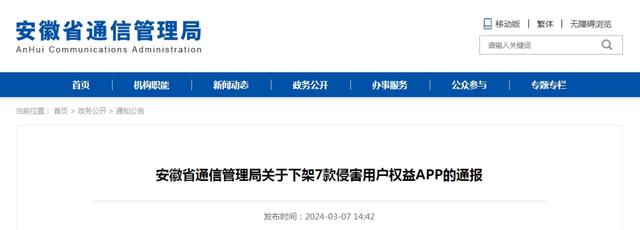 安徽省通信管理局关于下架7款侵害用户权益APP的通报(网页截图)