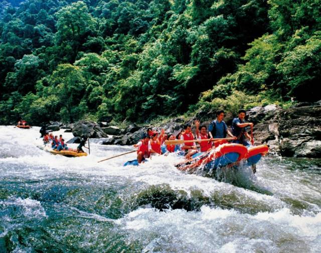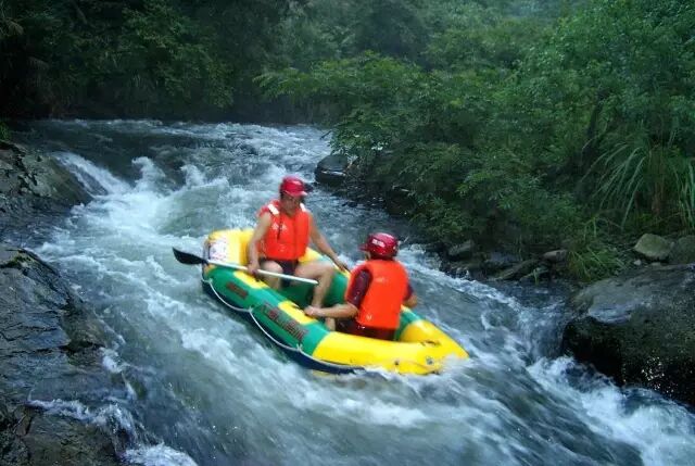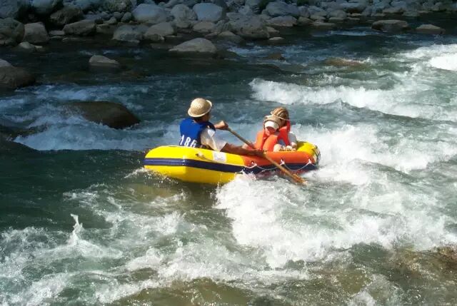 丹水漂流是1人或2人乘坐一艘橡皮小舟,手握一块1米长的木桨,自己划桨,自由放漂,过激流,经险滩,回旋于巨石之间,跌宕于碧潭之中,在左躲右闪、惊涛险浪之中领略与大自然搏斗的快感。