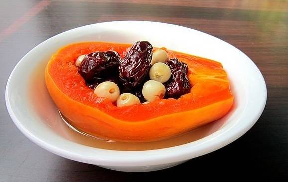 做法:将红枣以及莲子、冰糖加入适量的清水后放入锅中煎煮,煮熟后起锅备用。木瓜破开后去掉皮和籽,切块后和上面准备好的材料放在一起,蒸熟后就可直接服用了。