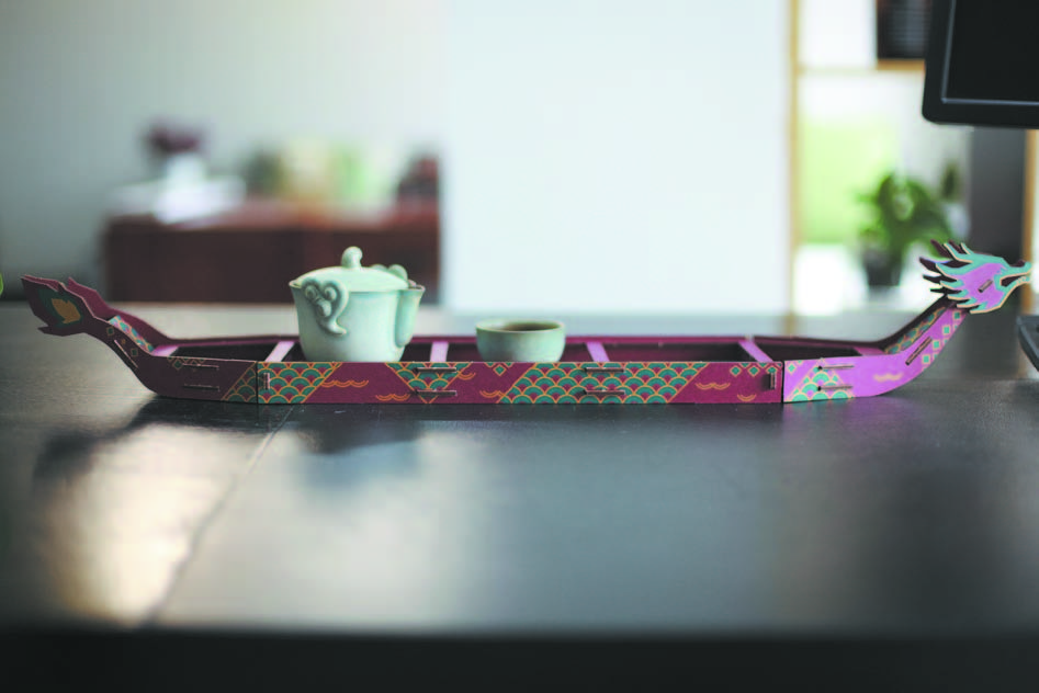 温州茶亦如此,它们将国潮“新装”与非遗“旧瓶”相结合。瓯窑茶叶罐、马蹄闻香旅行套组、蕉叶纹小套组、插片龙舟载瓯窑、汉臣瓯窑蕉纹盖碗套组等一系列文创产品,大多将本土茶叶与瓯窑、瓯塑美器相结合,将古老的非遗文化融于现代美学生活。这些国潮“新装”,不仅是一套套美学器具,更是通过茗茶、非遗创造出一种文化氛围。
