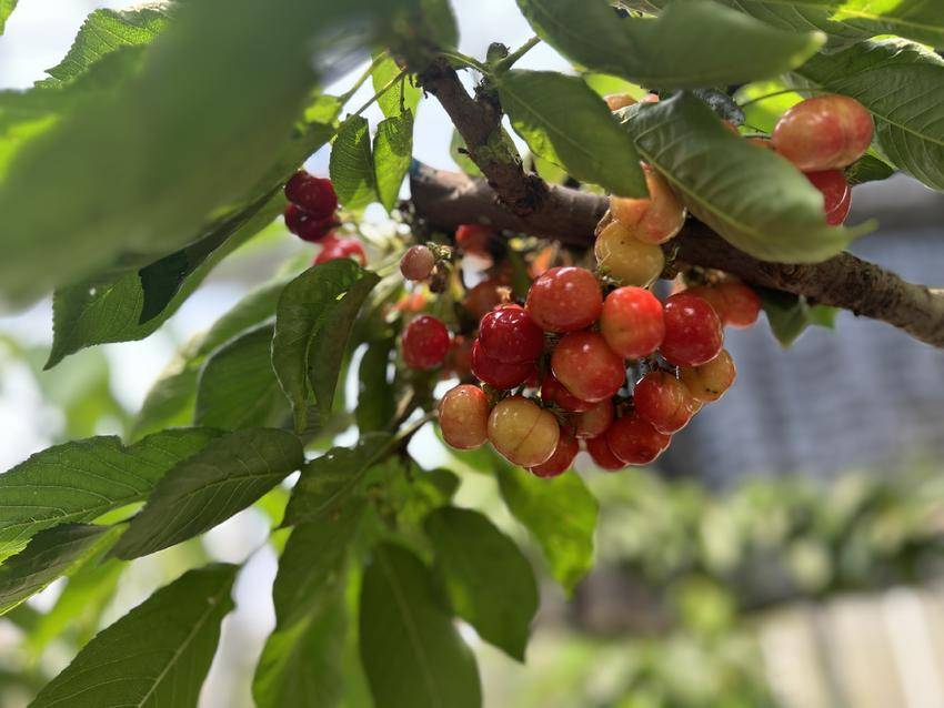 能在南方地区吃上脆甜多汁的高品质树熟大樱桃,离不开大棚内的精细栽培。“大棚隔绝了雨水和害虫,也就不用打药,保持大棚里温度适宜,结合水肥一体化技术,通过精心打理,长出的大樱桃个个硕大饱满、脆甜多汁。”已种植大樱桃5年的戴红霞自信满满。