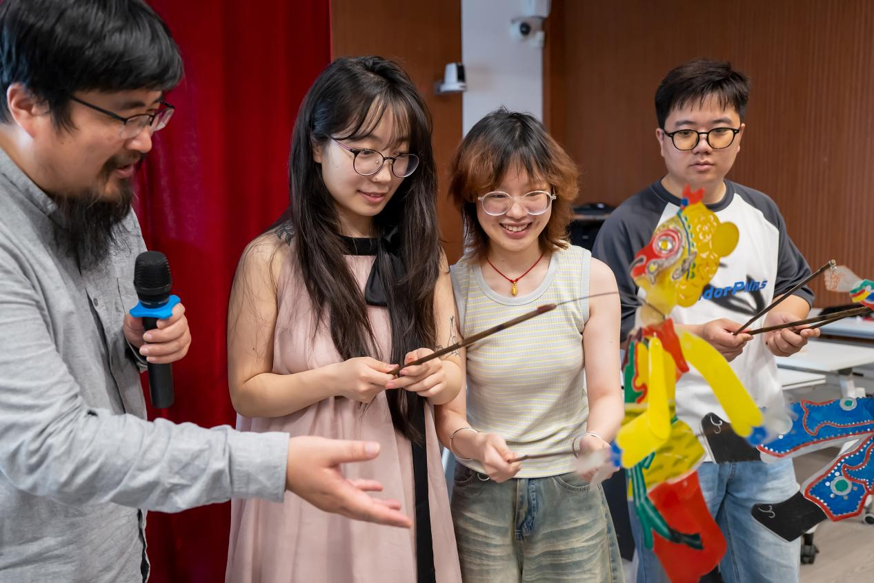 互动环节,耿纪朋教授引导在场学生分批次体验亲手操控皮影人走位、翻转、打斗、配乐、拟声等基本功,让同学们现场感受传统文化的独特魅力,在他们心中播下诚信友爱、智慧善良、坚韧勇敢的种子。 演出结束座谈时,湖北美术学院艺术人文学院党委副书记张乐表示,推出的“一出好戏”进校园活动是大力弘扬中华优秀传统文化融入大学生思政教育的火热实践,是“创造性转化和创新性发展”的生动体现。湖北美术学院艺术人文学院坚持文化育人和教育引导的双向发力,注重立足荆楚大地,深挖非遗文化中饱含的丰富文化内涵、历史底蕴和价值意蕴,用寓教于乐的轻松方式帮助大学生增强文化自信,厚植爱国情怀,涵养奋进品格。