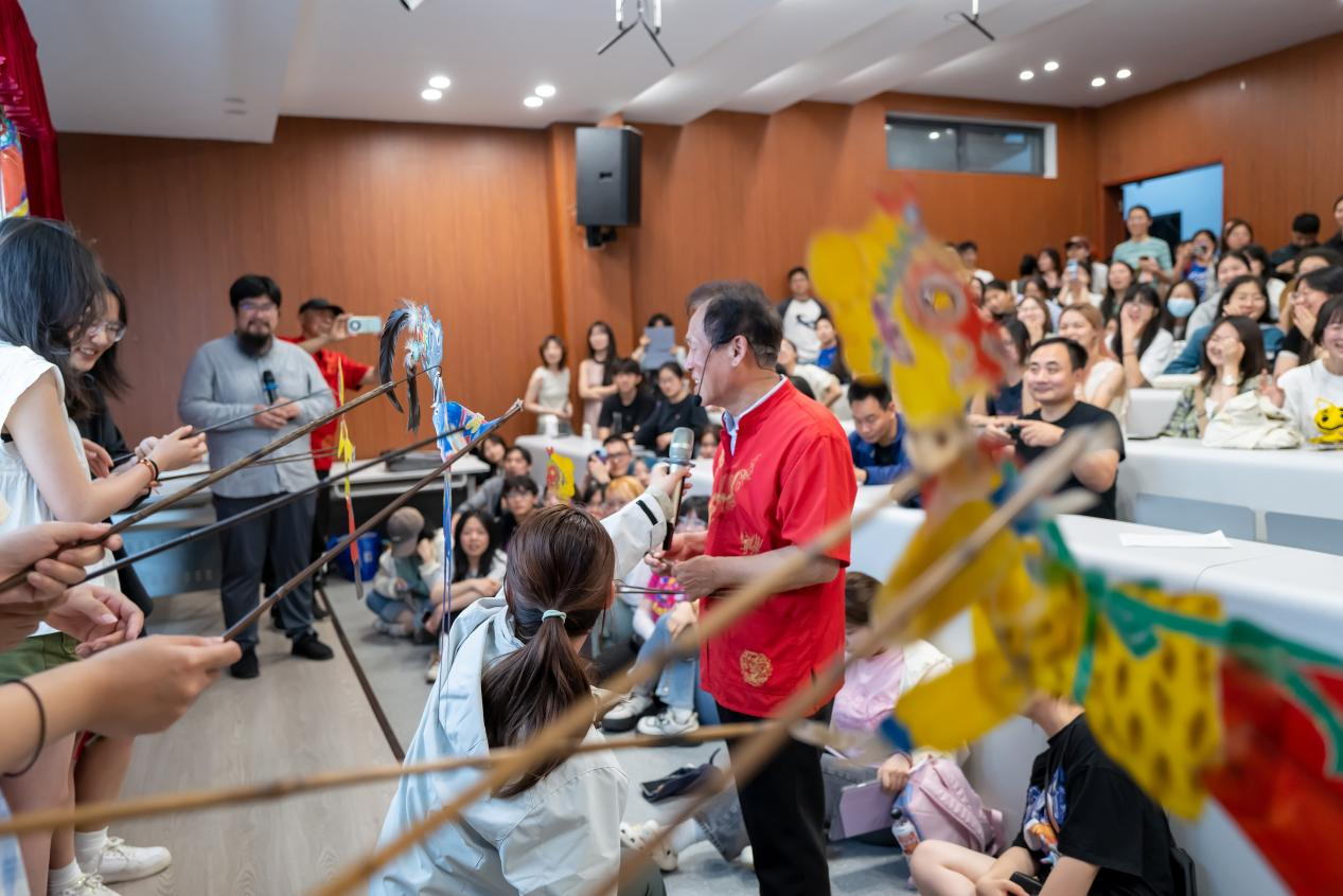 表演余尾,满头大汗的秦礼刚拿着正反角色的两个皮影人从幕后走向幕前,结合自身成长与演出经历向师生介绍国家级非遗项目云梦皮影,以及为皮影传承创新和对外文化交流方面作出的努力,道出了他人生在戏里,戏里有人生的真切体悟。秦礼刚还勉励青年大学生们,要坚定文化自信,勇敢站出来,自觉坚守住祖辈们留下来的技艺绝活,做时代迭变与代际转型中连接传统之美的新生代,让皮影戏焕发新生机。