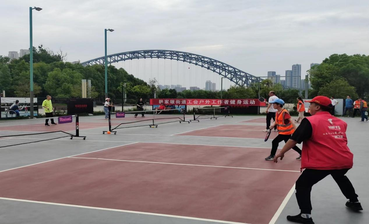 为进一步提升户外工作者的获得感、幸福感和归属感,营造关爱劳动者、尊重劳动者的良好氛围,5月10日下午,武汉市硚口区韩家墩街道“工会爱心驿站”在汉江湾匹克球馆举行了一场匹克球健身运动,来自邮政、环卫所及12个社区的外卖快递员、环卫工人、网约车司机等近70名户外工作者参加了本次活动。