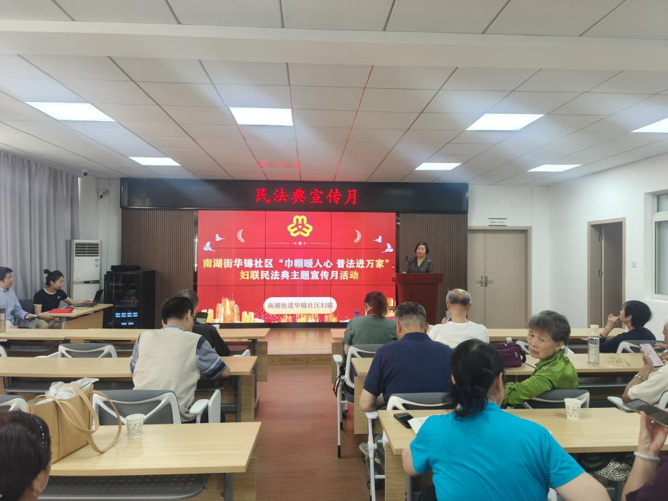 为积极推进《中华人民共和国民法典》的实施,提升广大妇女群众法律意识,增强妇女维权意识及家庭风险防范能力。5月17日,南湖街华锦社区开展“巾帼暖人心·普法进万家”民法典宣传月主题法治宣传活动。