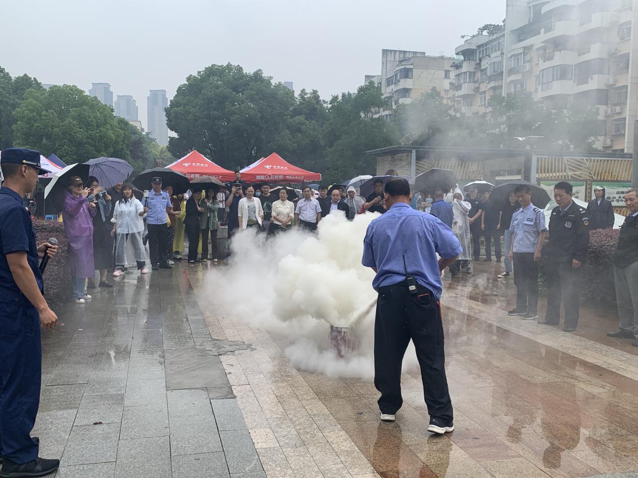 南湖消防站站长方兴给大家演示干粉灭火器的使用方法