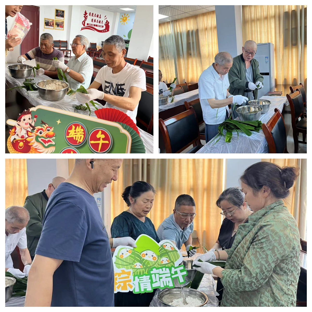 在老师的细心指导下,居民们热情高涨,纷纷动手尝试。大家将粽叶折叠成漏斗形,填入饱满的薏米和香甜的馅料,再用细绳扎紧。不一会儿,桌上便摆满了形状各异的粽子:有的呈三角形,有的四角分明,还有的长条形状,别具一格。淡淡的粽叶香气弥漫在空气中,令人垂涎欲滴。居民们围坐一起,边包粽子边聊天。大家交流着各自的包粽子技巧,分享着过去端午节的美好回忆和有趣故事。现场笑声不断,气氛温馨而热烈,充满了浓厚的节日氛围。