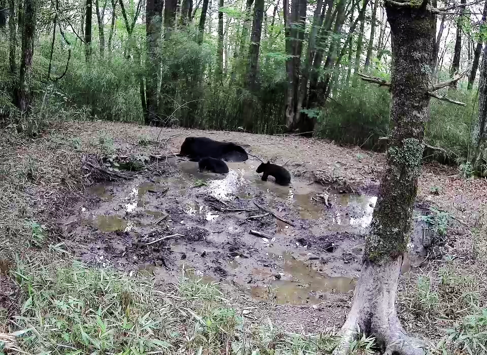 在拍摄的影像里看到,三只野生黑熊,一大两小,通体黑鬃毛,根据体态辨别,可能是一只熊妈妈带着两只熊宝宝出来捕食、玩耍,状态良好。它们先后在多个布设的红外相机镜头前觅食,在森林里嬉戏,还在积水的泥潭里饮水和洗澡,画面格外萌趣可爱。