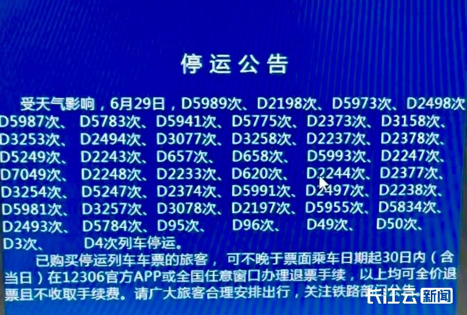 长江云新闻记者从国铁武汉局了解到,受湖北及周边地区降雨天气影响,6月29日,武汉站共停运62趟车次,武昌站停运40趟车次,汉口站停运48趟车次。武鄂黄黄城际铁路 “新城快线” 全部列车再次停运一天。