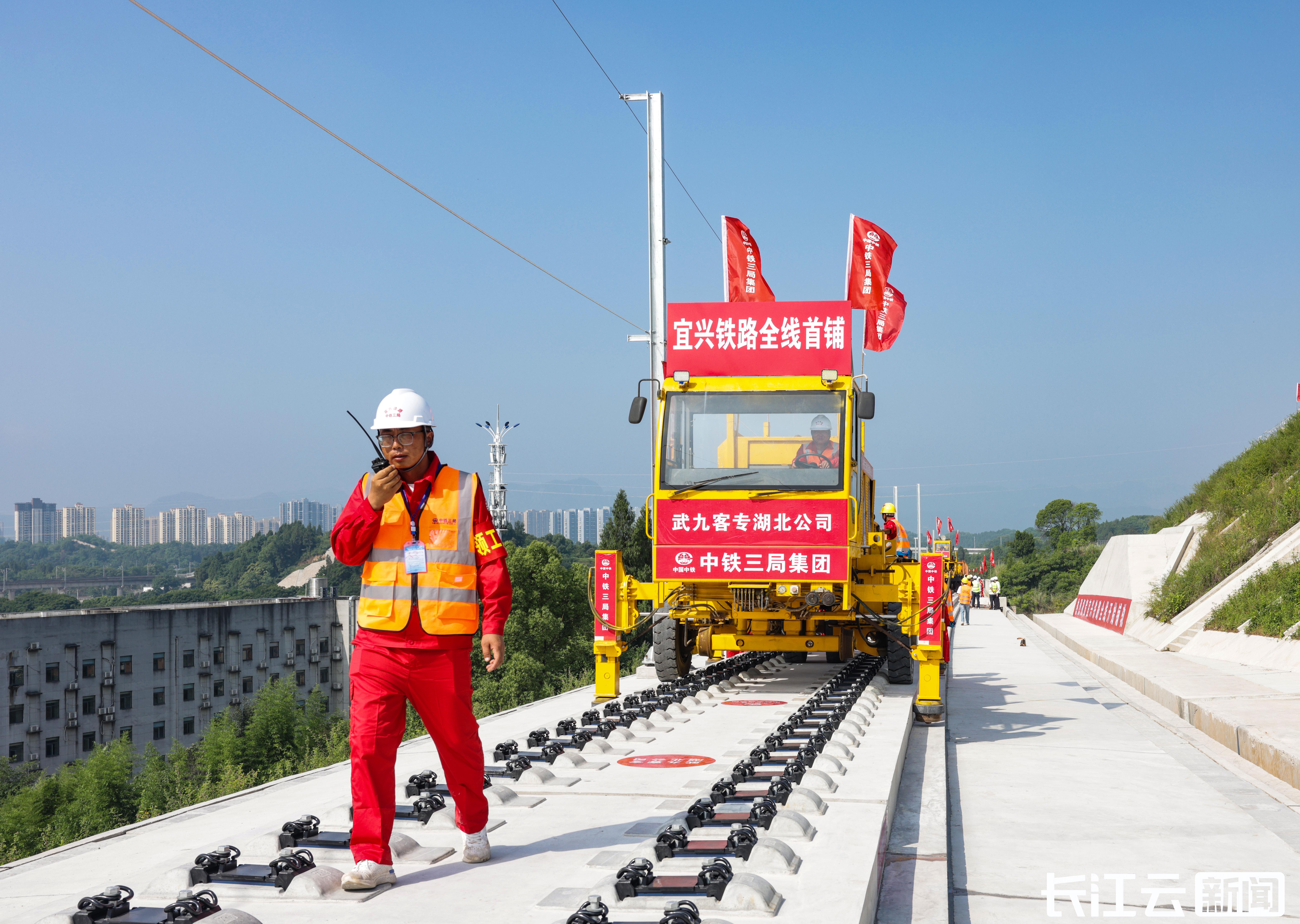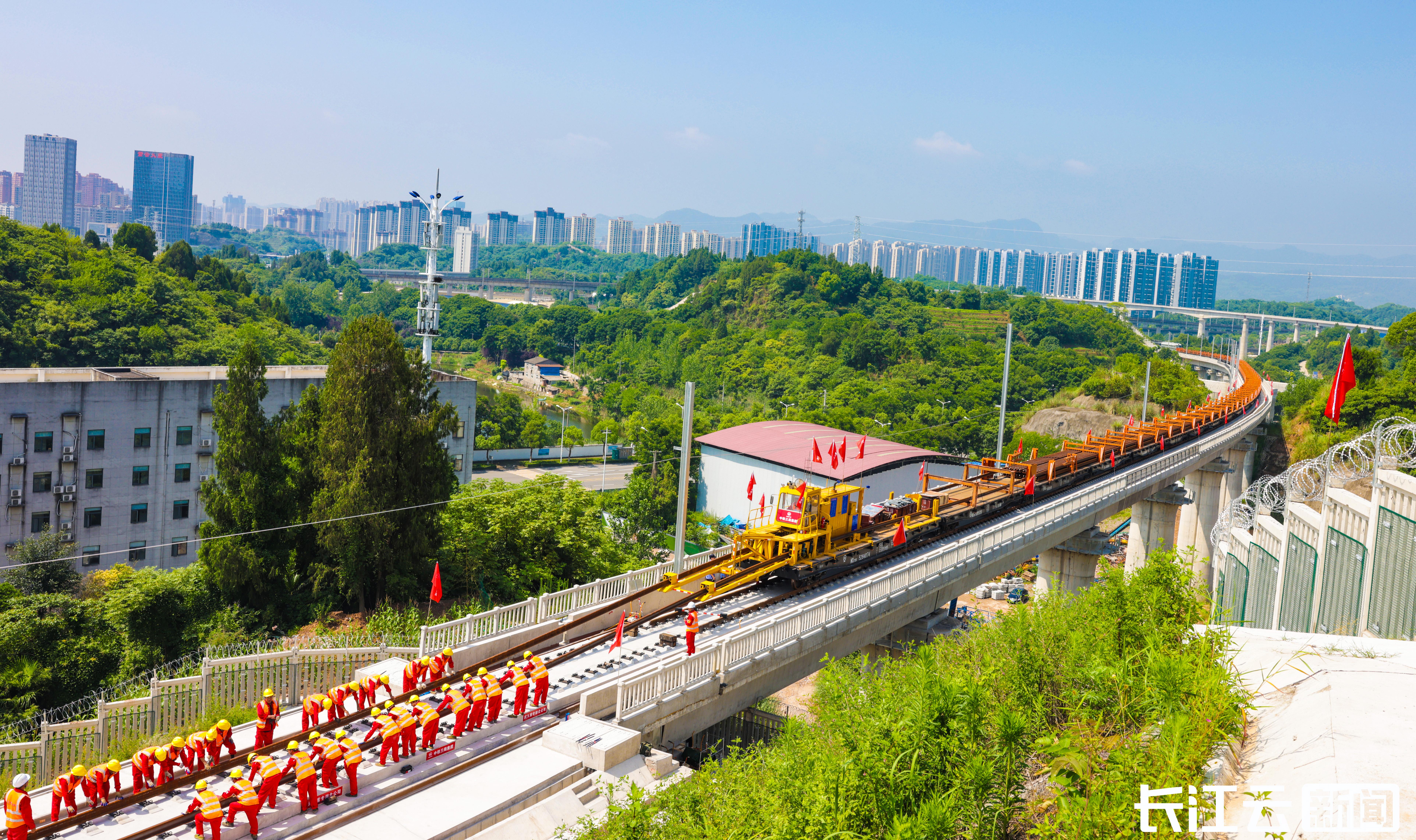 长江云新闻记者从中国铁路武汉局集团有限公司了解到,6月30日,在宜兴铁路联丰村特大桥施工现场,随着首对500米长钢轨平稳、精准地铺设在无砟道床上,宜昌至郑万高铁联络线(简称“宜兴铁路”)正式进入长轨铺设阶段。
