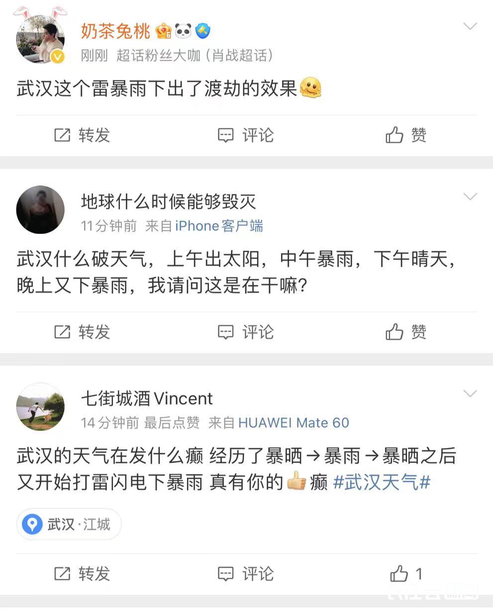 今天(7月3日),不少武汉网友发文吐槽:武汉的天气太多变!上午出太阳,下午暴雨、妖风,大雨下十分钟就转晴,晚高峰又下大雨,武汉的天气到底怎么了?