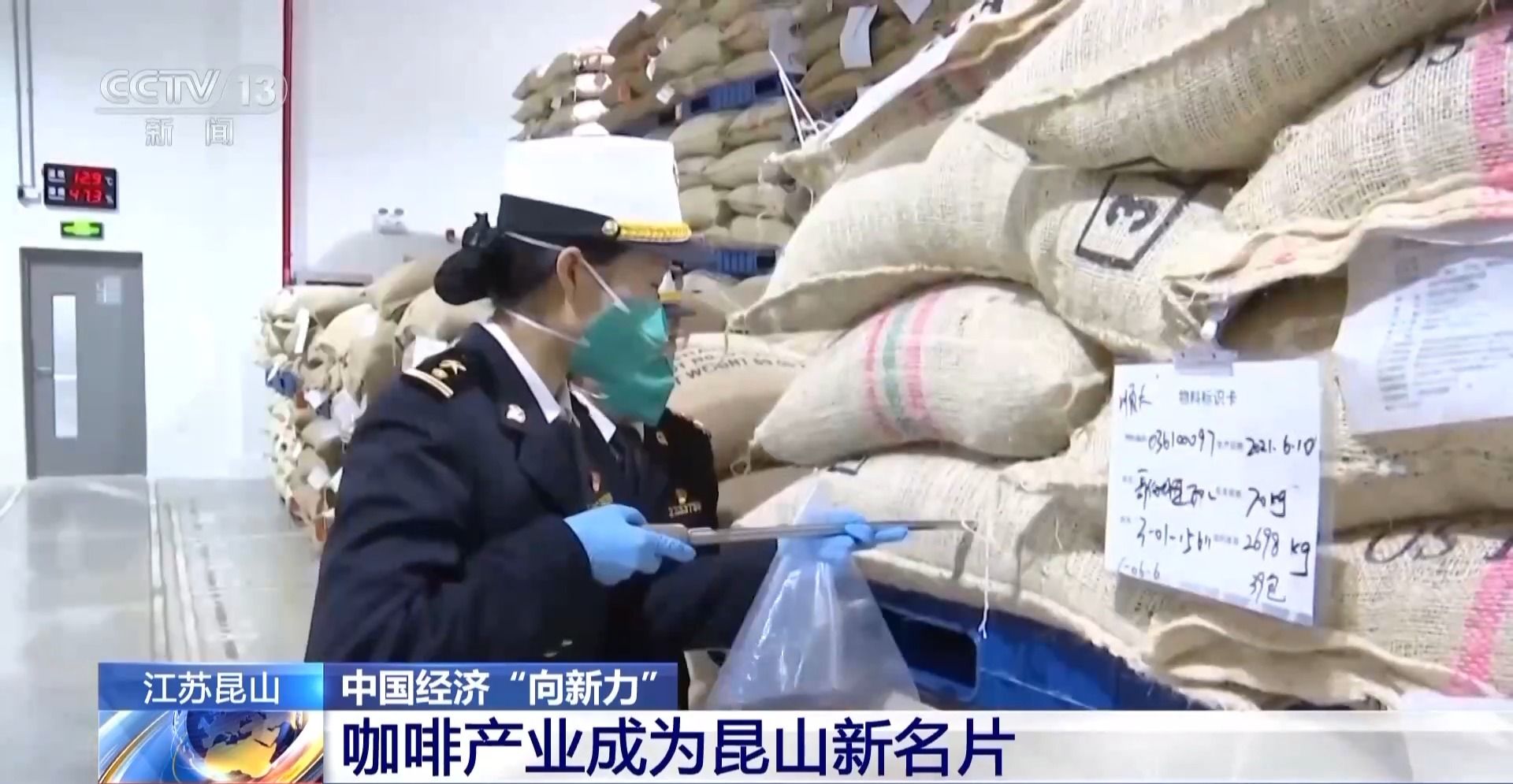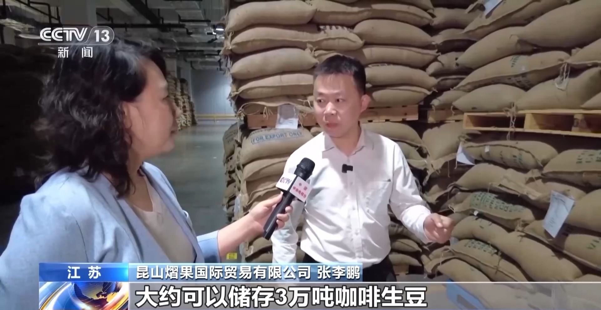 昆山熠果国际贸易有限公司的张李鹏介绍,一期仓库的面积近5万平方米,可以储存3万吨咖啡生豆,大约可以做成20亿杯咖啡。不同颜色的麻袋,代表着从不同产区运来的豆子,除了给江浙沪供货之外,最远可以送到新疆、西藏。