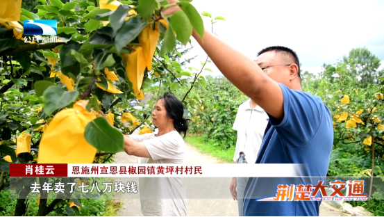 在恩施州宣恩县椒园镇黄坪村黄傅公路沿线,放眼望去,黄金梨挂满枝头,村民肖桂云在家门口见到熊国庆这位老熟人,格外高兴。