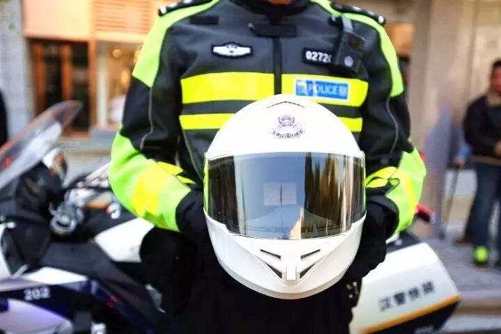 值得一提的还有这个头盔,它跟我们一般接触的头盔大有不同。不仅外形帅气,使用上也是功能强大,蓝牙可以连接大队内部电台,随时保持联络,送话器可以连到车上的喇叭,对外喊话,内外兼顾。