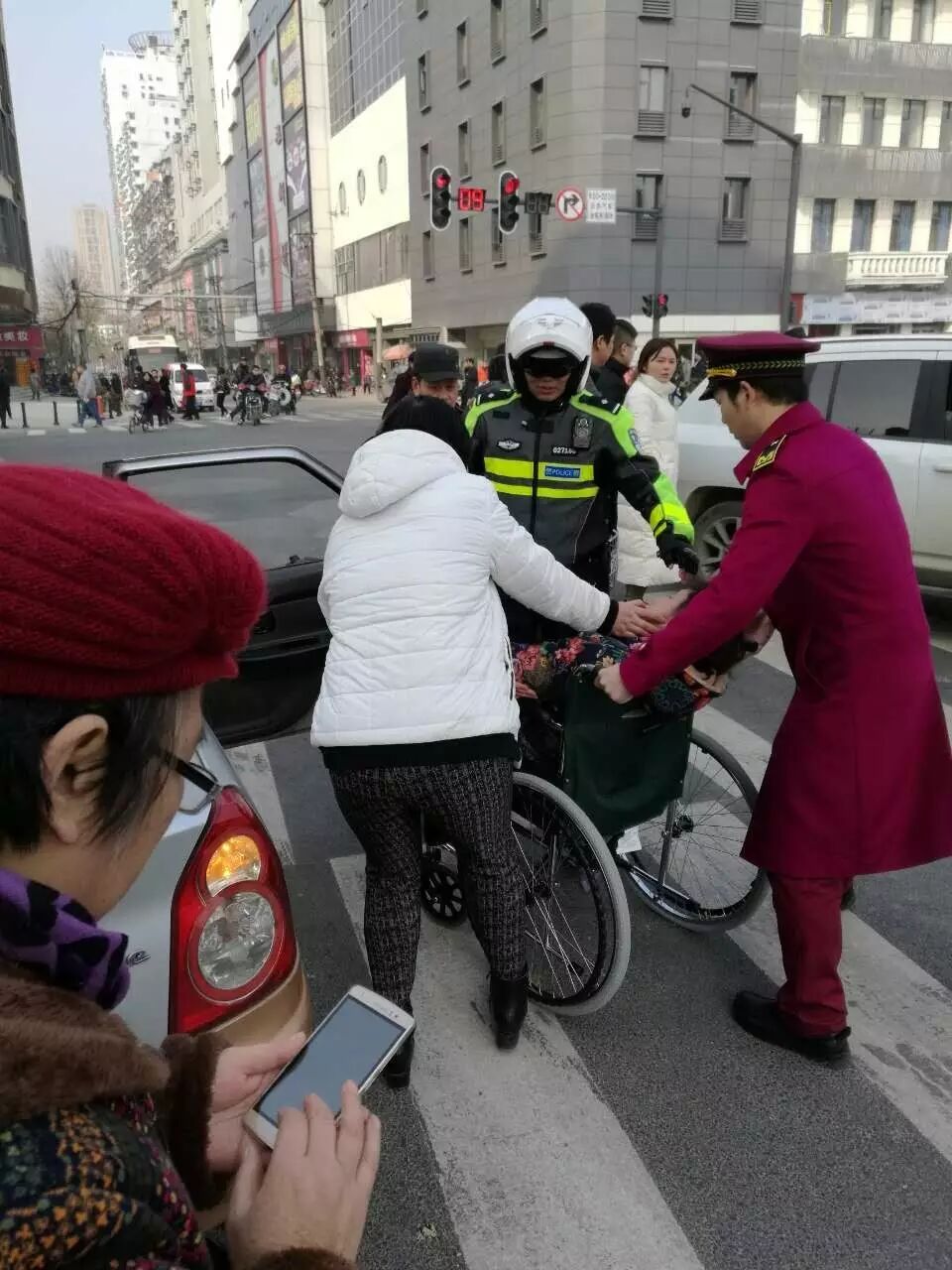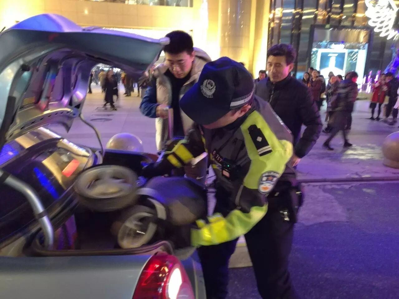 今年平安夜晚上,武商广场门口,搭乘出租车的市民很多,有一家人推着婴儿车在风雨中拦出租车无果,正在执勤的汉警快骑机动队民警张强赶紧在武商路口提前拦了一辆出租车,并帮忙把婴儿车抬上了出租车。