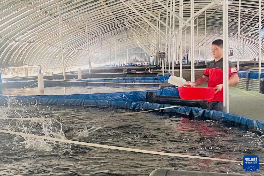 工作人员在养鱼设施内投撒饵料。新华社记者宋立崑 摄